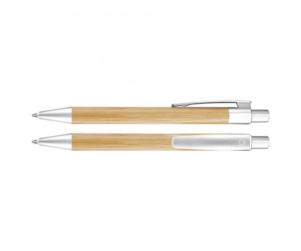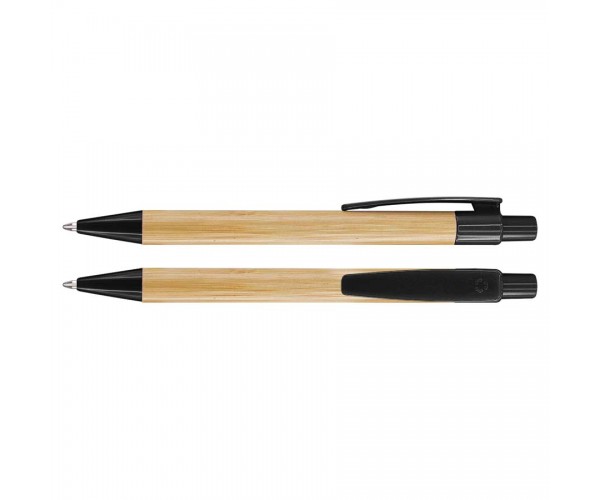 Bolígrafo modelo "Baker". Cuerpo de madera de Bamboo, terminales de plástico PET reciclado. Escritura azul.