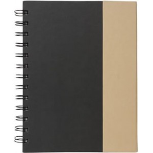 Libreta ecológica con tapas duras(piedra) de cartón reciclado con doble espiral. Dos post it rectangulares (grande y mediano), cinco post it señaladores de diferente color y bolígrafo.